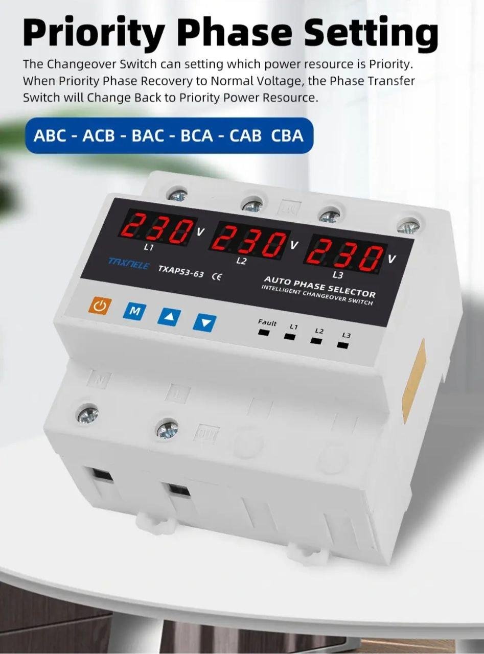 This 220V single-phase phase selector has been designed to power a single-phase load from a three-phase power supply, in order to maintain uninterrupted power supply. Depending on the presence and quality of the voltage on the phases, it will automatically select the optimal power phase and switch the single-phase load supply to it.