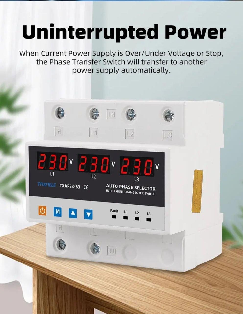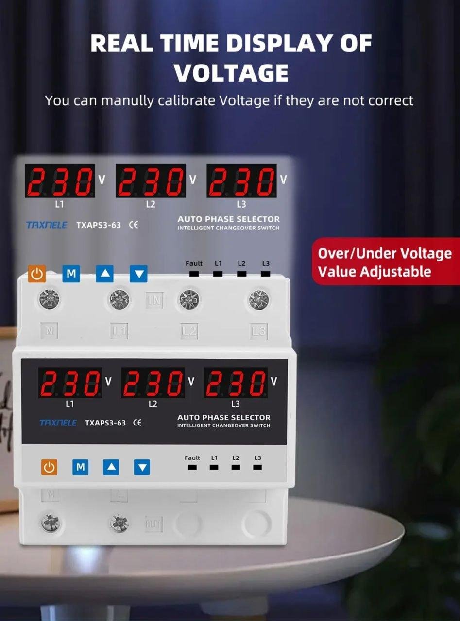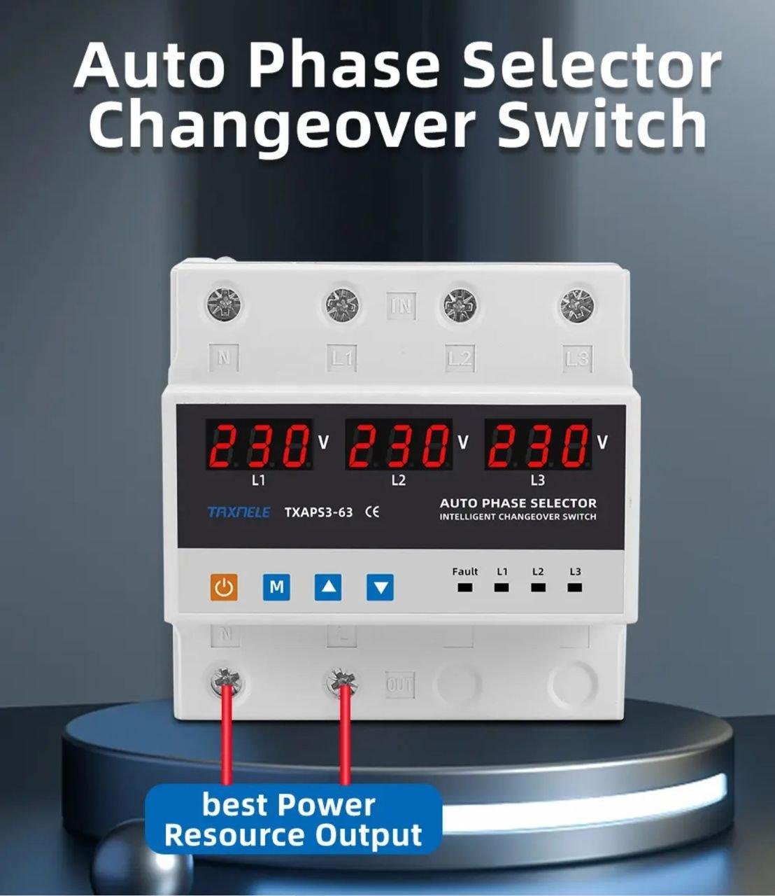 This 220V single-phase phase selector has been designed to power a single-phase load from a three-phase power supply, in order to maintain uninterrupted power supply. Depending on the presence and quality of the voltage on the phases, it will automatically select the optimal power phase and switch the single-phase load supply to it.